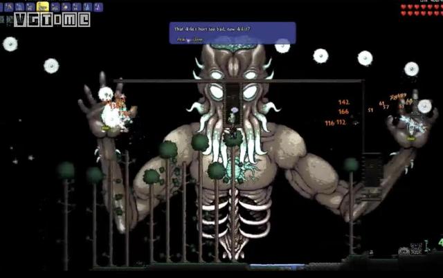 在这里,《泰拉瑞亚》“建造”层面的特性得以显现,玩家可以在战斗时制造安全距离或者安全空间来降低战斗的难度,比如常见的一种玩法是在BOSS上方建立一个平台作为输出时的安全跳板。更为复杂而精妙的办法,是根据BOSS特性建立五花八门的“机关”,例如对付某些速度极快还自带闪现的BOSS,可以建立牢笼机关,活活困死BOSS,或者创造类似“过山车”的机关,使得BOSS的相对速度变得缓慢,即便没接触过《泰拉瑞亚》,此时应该也能想象扮演“卑鄙的不死人/外乡人”的快感。