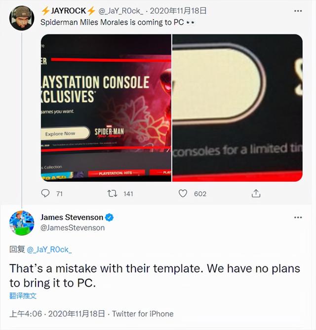在PC玩家们都热议讨论之时,开发商Insomniac Games的社区总监James Stevenson在原文下方澄清,这是PSN样板出现了问题,Insomniac没有计划让《漫威蜘蛛侠:迈尔斯·莫拉莱斯》登陆PC平台。