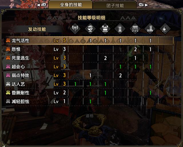 技能:龙气活性5,怨恨3,死里逃生3,超会心3,弱点特效3,达人艺3,昏厥耐性2,减轻胆怯1
