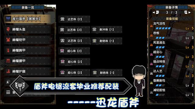 接下来说下配装思路,电锯流由于更多是多段伤害,所以在会心伤害上收益尤其重要,天慧套本身自带弱点特效3,配合迅龙盾斧的40%会心率加持,有效部位会心率达到90%,超会心满的话,伤害得到了更高的保证,但由于持续输出的关系,斩味方面丢失严重,所以配合达人艺来保证斩味的持续性,当然,如果打点不准的话,也可以考虑换成利刃3,另外昏厥耐性/减轻胆怯这两个技能可以根据自己的喜好去选择。那么在选择护石方面提升更快的也较为明显,考虑方向攻击/怨恨/超会心/达人艺或利刃这几个方面。