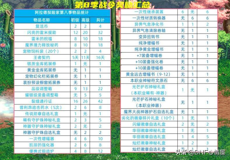 与其说是第8季阿拉德探险记,倒不是叫做“战令复刻”,表格中汇总的奖励,基本上换汤不换药,并无新的花样出来。然而就算这样,战令系统在游戏里,也属于最划算的东西。
