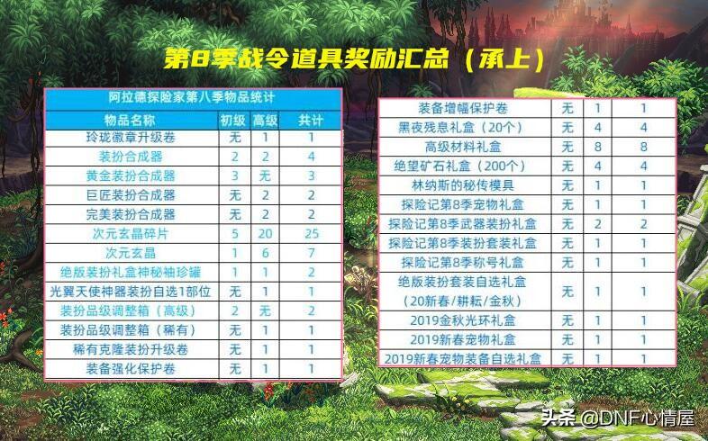 每一期战令能给龙袍单件,第8季还是光翼天使单件,大翅膀风格神器装扮。次元玄晶和碎片材料,战令也会白送玩家,搏一搏神器装扮合成。你会发现第8季的数量,跟上一期对比,并未发生变动。