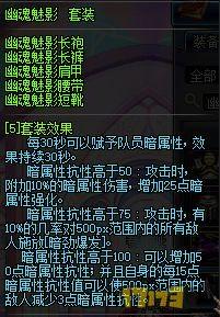 目前版本使用率最广的套装,没有之一,基本上是全民幽魂套。高暗强并且套装属性有10%的暗属性白字,用这套需要堆暗抗,堆到220,进图吃个暗符咒再加上套装属性的50暗抗就可以完美获得幽魂的效果。