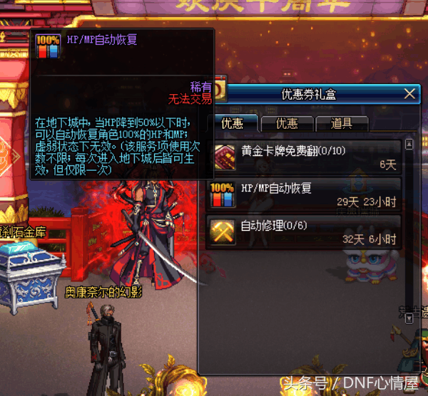 而这个东西就是魔王契约自动回蓝回血药剂,在超时空副本中能够生效。我们都知道,商城有魔王契约,可能我们只在意自动修理和免费翻牌,没有注意到,还有一个HP/MP自动恢复药剂,30天的时间,也才300点券,这对我们来说,就是皮毛。而这魔王契约自动回蓝回血,在超时空副本中有奇效!