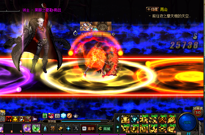 一阶段的虚弱机制是魔界大战所有机制中最难的。在触发机制时,4名玩家身上会出现火、冰、光、暗4种颜色的护盾。BOSS会在屏幕上方和下方铺满属性带,只留给玩家中间一篇区域,然后从最左侧或者最右侧发动4种属性的魔法球攻击,需要带有相同属性护盾的玩家上去挡,否则会受到大量的伤害。在BOSS切换属性的时候玩家要注意新的元素带蔓延的方向,比如火属性是从左往右蔓延的,则说明BOSS会从左侧发动火属性球攻击。另外在抗属性球的时候玩家不能站立不动,因为属性球有击退效果,最好是前冲或者举盾之类的技能来抵消属性球的冲击力。
