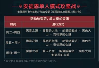 安徒恩有三条线路,只有第二个图不一样。周二至周四是震颤的大地,周五至周六是舰炮防御战,周日到周一是擎天之柱。个人觉得除擎天外,其他两个还是比较好打的。震颤只需要控制右边怪物,秒掉即可。如果没有控制,注意别被吸住,等无敌过后再放技能就可以了,左边没有什么难度,对着一顿撸就好了,还是比较简单的。舰炮防御战注意红字提示的时候不要释放无色技能就可以了。如果不会打擎天或者输出不够的话,建议等到周二到周六的时间段去打,而且这个时间段刚好是团本更新的时候,这样我们就可以更轻松一点。这里提醒大家一下,如果急需浓缩的魔能石,可以去打单人,单人每次最少提供十七个魔能石,最多二十三个。如果周年庆送的无尽首饰制作图还没做完的话,可以去打单人。
