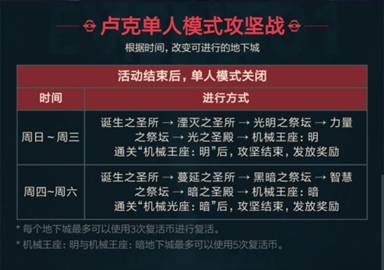 卢克只有两条线路。周日到周三是机械王座:明;周四到周六是机械王座:暗。和平时打的团本线路差不多,比团本少入场几次,圣殿领主怪物也变了,绿名怪翻身农奴把歌唱,当起了领主。卢克只要熟悉怪物机制,还是比较好打的。卢克老爷子连击次数也少了,随便打打就破防了。卢克路线需要注意的地方就是,根据自身的属性来选择是打暗卢克还是光卢克。比如你的角色暗属性强化高,你就去打光卢克;如果你的光强化高,就去打暗卢克,如果属性强化都相同,就看抗性,属性强化减去抗性,哪个高就打哪个。这样就会容易许多。每周日更新副本次数,所以我们每次打的是光卢克,如果小号是暗属性强化高的话,就需要等两天了。当然强行打也是可以的,只是多花点时间而已。