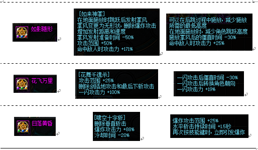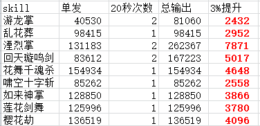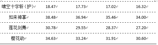 下表为各技能的CD加成情况。对普雷团本来说,目前主要的关注点还是输出能力,而在单体怪物的情形下,不用考虑群伤因素,因此对范围没有太大需求,正常情况下不会空技能。所以,通常性的选择是“红、蓝、紫”。部分技能如乱花葬,考虑在20秒内压缩CD增加次数时,可以优先减CD。
