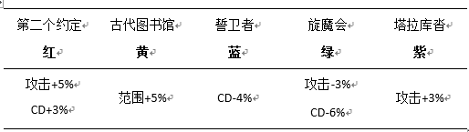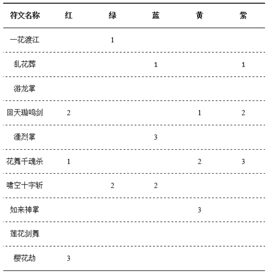 以花舞千魂杀为例,一个技能有五种颜色的符文,分别对应五种不同的加持属性,属性如下表所示。