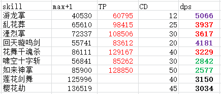 对护石加成下的技能进行统计,TP均为1.5倍,统计数据如下
