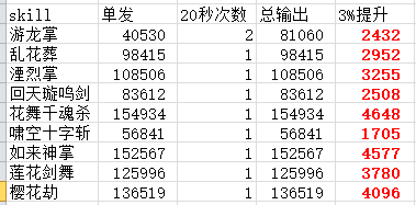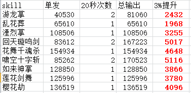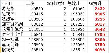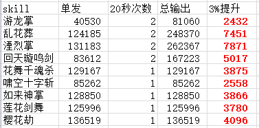 表中,单发差为增加护石所产生的技能百分比增加量,双发差为20秒内放两次该技能对比放一次的收益。