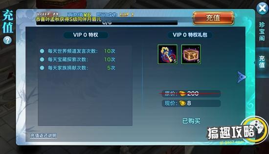 VIP0,需花费0元,特权:每天世界频道发言次数10次,每天宝藏探索次数10次,每天家族捐献次数5次,可购买V0特权礼包,礼包里有5把黄金钥匙和5个黄金宝箱。