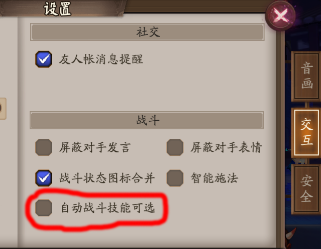 首先,关于功能如何开启。点击自己的头像,然后将右边的设置选项切至交互选项,勾选自动战斗技能可选,就可以开启该功能了。战斗的时候直接点击式神头像,选择该式神的头像,就能在只能和技能间切换了。
