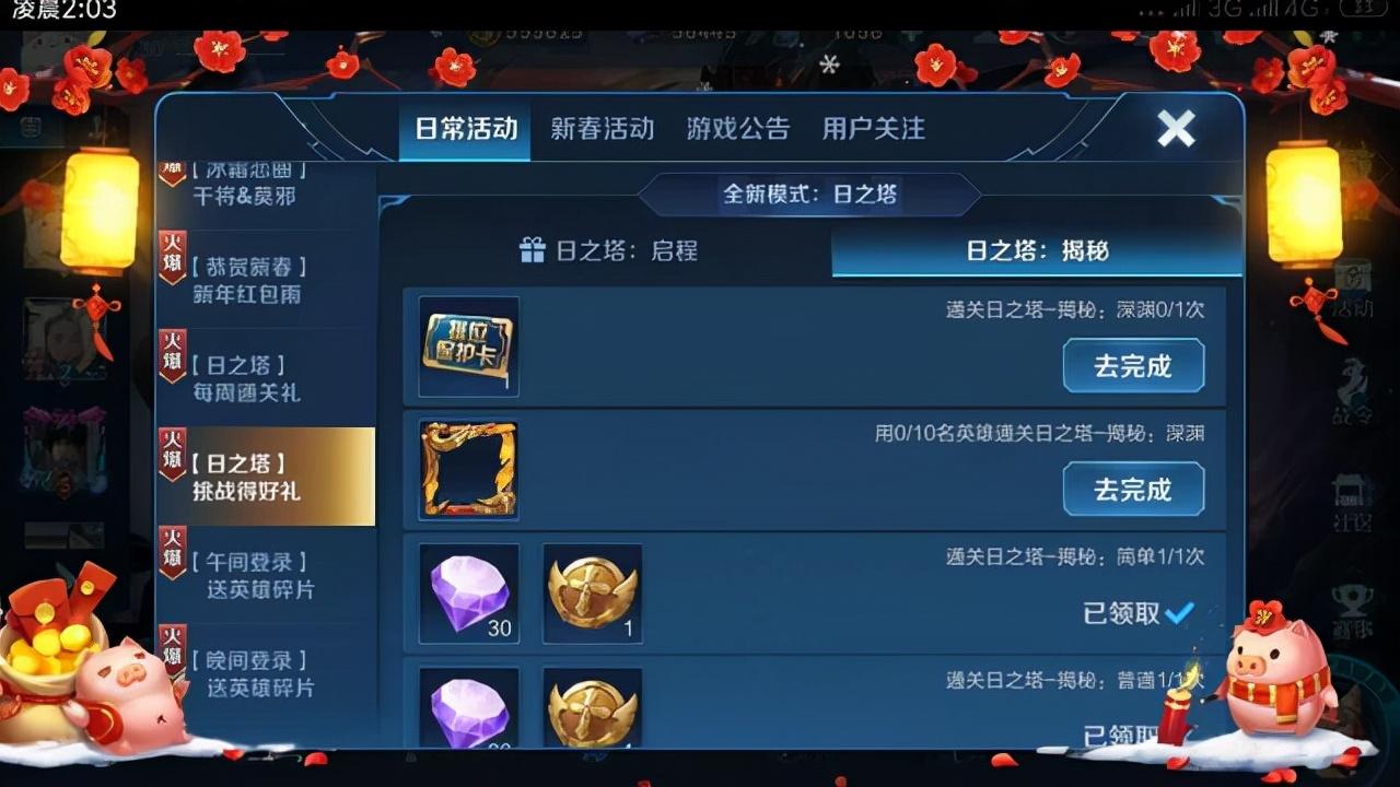 官方会不定时在日常活动中,安排上日之塔的通关奖励,里面有大量的钻石、星元皮肤、头像框和其他福利道具,当然也少不了排位保护卡。