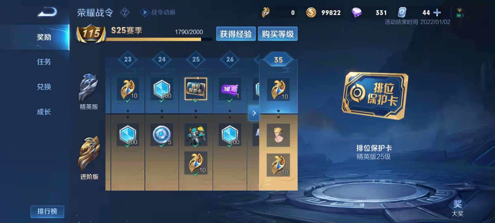 玩家无论是否进阶战令,都能在10级和25级的时候,拿到两张排位保护卡。