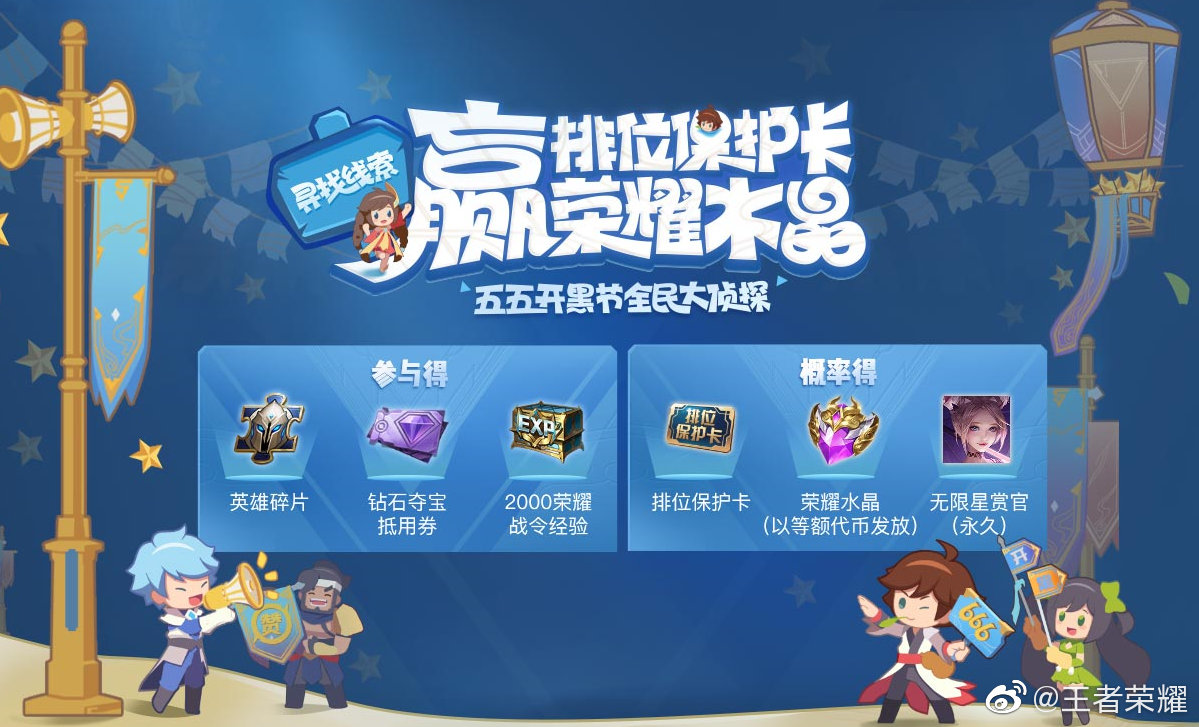 就像今年的五五开黑节,官方推出了两个福利活动,第一个是打捞漂流瓶活动,第二个是全民大侦探活动,参与活动即可获得排位保护卡,还有几率抽取永久史诗级皮肤。