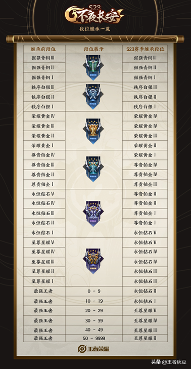 新赛季的段位继承和S22赛季的一致,荣耀以上掉星耀二,王者1星掉钻石2。其他段位的玩家可以根据自己的段位判断自己会掉到哪个段位。