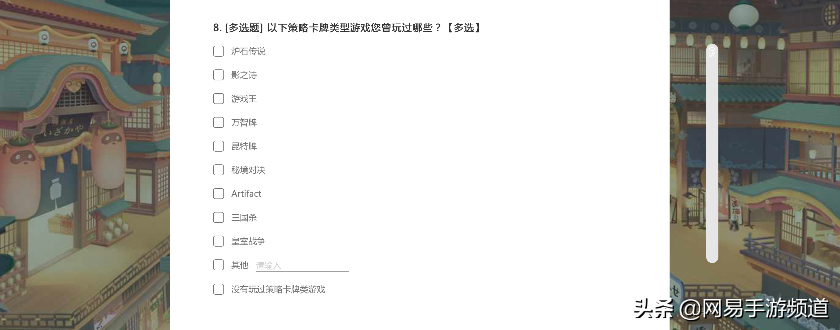 问卷向玩家提问:“以下策略卡牌类型游戏您曾玩过哪些?”,说明这应该会是一款偏向策略类型的游戏;而选项中有《炉石传说》、《游戏王》、《万智牌》、《皇室战争》等等,覆盖子类型还是相当的广,几天后技术测试将会开启,相信届时会有不少尝鲜的大神为大家揭秘。