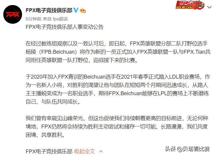 FPX官宣原文如下图所示,表示二队打野选手北川正式加入1队和Tian一起担任打野位置,之后介绍了一下北川的情况,在2021年春季才开始打职业,打了不到2个月的时间就从主播转型成功,最后就是希望北川在LPL赛场上继续努力,和队伍一起成长,拿到更好的成绩。