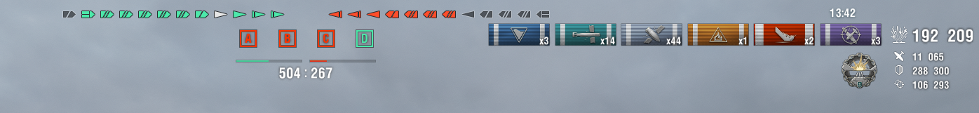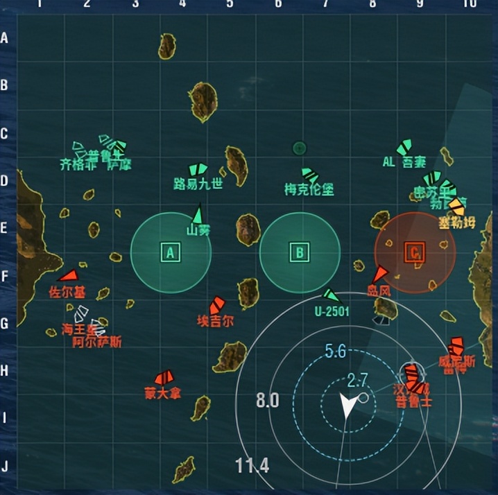 出生在C点,对方有佐尔基,岛风和一个小人,无航母。由于C点无法雷击选择去B点找机会,进入B点后发现AC两点有人进入,立刻加力从B点向下冲,以6.5km距离从中间穿过了埃吉尔和汉诺威(没有丢雷),最后走到如图位置吃肉。