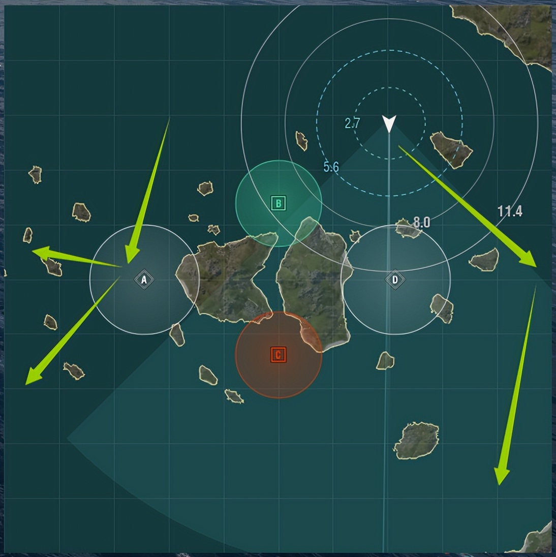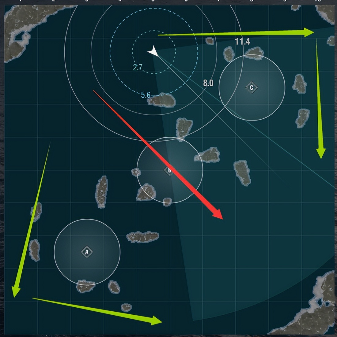 A点外侧岛屿较多,人多堆在A外线岛群或AB/C中间,A点出生的情况下可以选择占点,但有对方驱逐舰互踩的情况要立刻离开(不浪费时间),视对面船团决定走位方向。