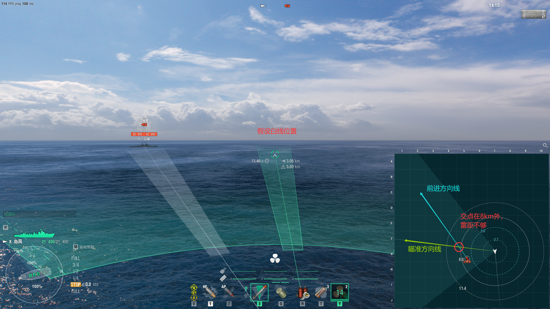 如图一,假设白线位置在图里的瞄准方向,目标在鱼雷射程外。瞄准白线位置,观察小地图上的目标前进方向线(有一根白线,用蓝色标出)和自己的瞄准方向线(有一根白线,用绿色标出)。