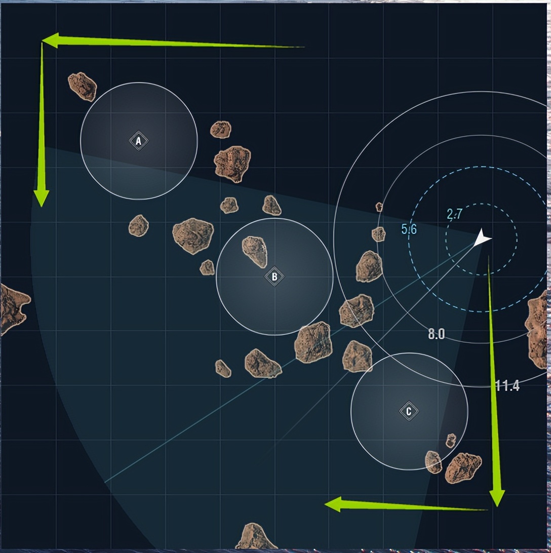这类图双方船经常堆在边线,两个船团之间的距离比较大。一般依旧采用AC拉边,如果在边线撞到大量船可以考虑进点绕侧面。无航母局可以考虑B点直下。
