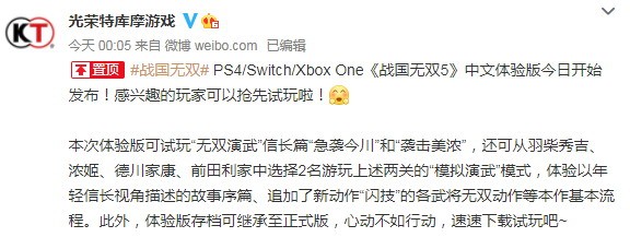 今日(6月17日)光荣特库摩官方在微博上宣布,《战国无双5》PS4、Xbox One和Switch中文体验版已发布。体验版包含游戏剧情开头的部分内容,存档可继承至正式版。
