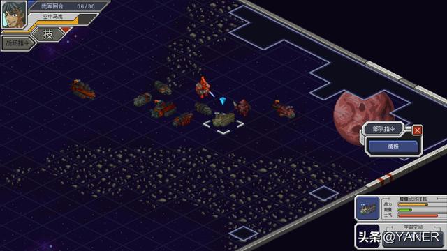这里可以看到选中舰队后,可以进行攻击,招募,训练,调动,占领以及查看情报,待机等选项,以格子显示可移动范围。