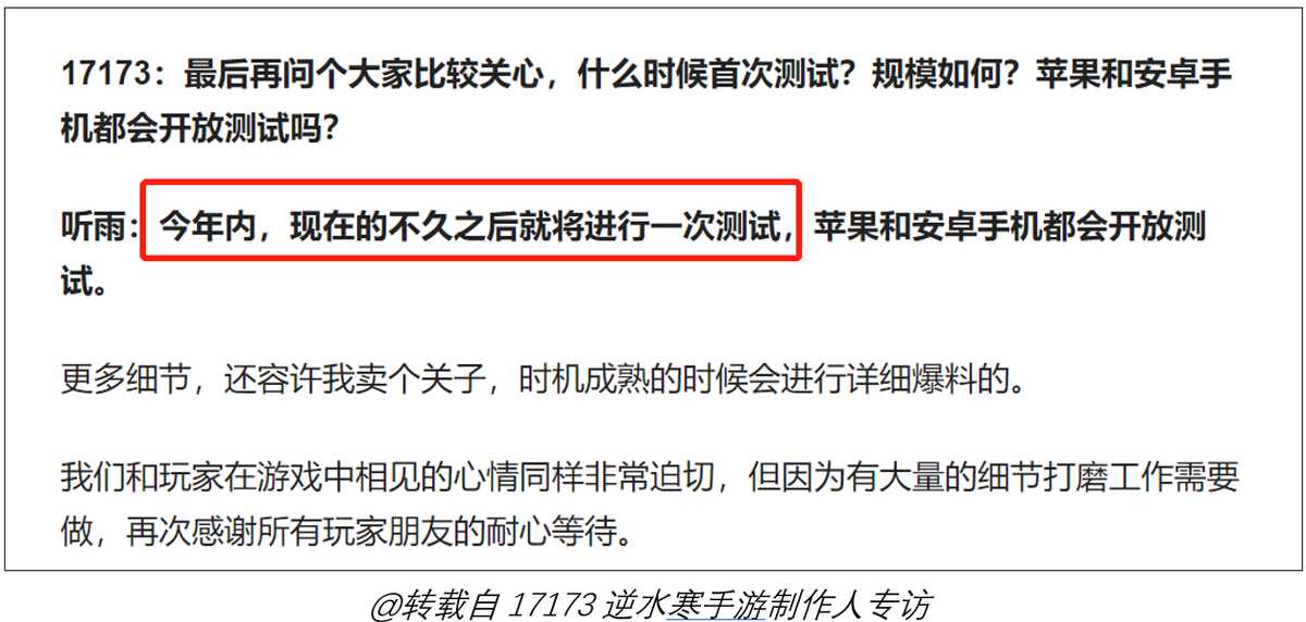目前,根据《逆水寒》手游制作人听雨,在接受17173采访时透露的消息是:已经完成70%的制作,今年年内会开启一次线上测试。