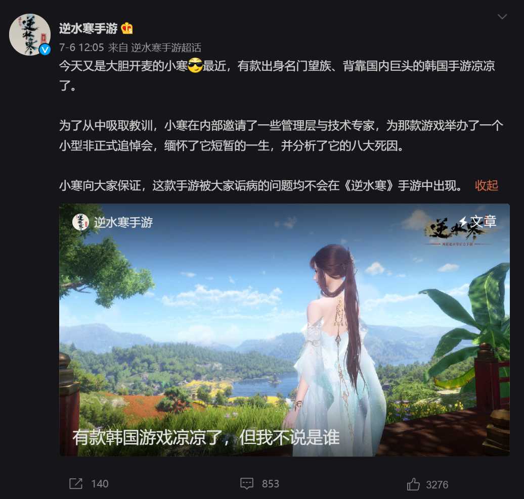 是的,逆水寒手游官方开创了点评同行的先河。最近,逆水寒手游官方微博发布了一篇题为《有款韩国游戏凉凉了,但我不说是谁》的文章,用辛辣的言辞,分析了导致其失败的“八大死因”,包括梦回2000年的挂机、逼肝逼氪、区别对待国内玩家、UI混乱、粗暴移植、不尊重剧情等等。