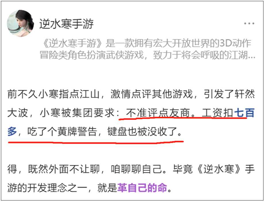 但这种锐评友商的行为,还是太“跳”了。逆水寒手游的官博也因此受到了惩罚——被集团扣了700多的工资,吃了黄牌警告,键盘也被没收了。