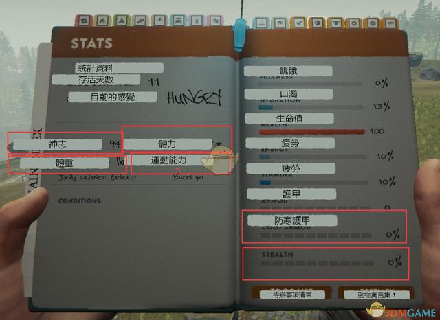 除了以上六种基础属性以外,森林还有7条额外属性,这7条额外属性需要打开生存手册(默认B键),然后翻到统计资料一页才能看到。