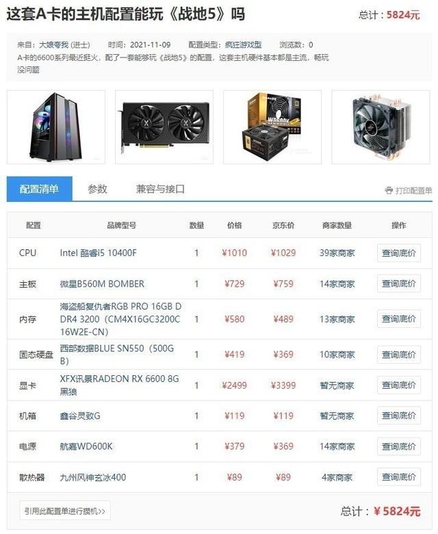 显卡推荐GTX 1060 6G或者RX 580 8G以上即可,实际测试当中,RX6600显卡大概能在高画质,2K分辨率驱动战地5来到89帧的水准,可以满足流畅的需求,在1080p下可以达到139帧,流畅度更好,因为上方的配置单当中也没有具体搭配的显示器,那么我还是建议搭配1080p的高帧率电竞显示器来协同用吧。