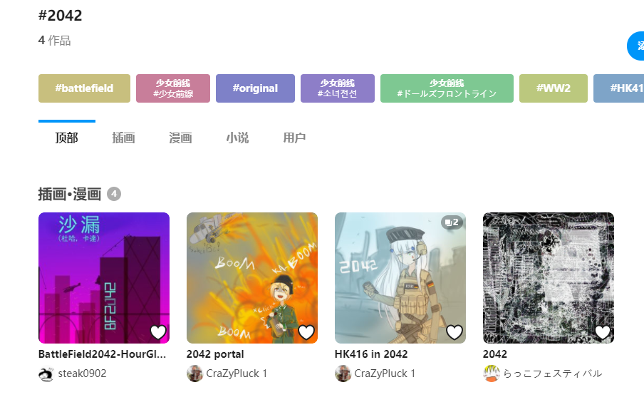 Pixiv可能不是一个足够客观的参考载体,不过目前在pixiv上的《2042》作品只有4个,且其中并没有专家的同人创作,也能一定程度上反映专家们在创作者群体中受冷的窘境。他们或许很有魅力,但玩家们并没有get到这些专家的闪光点。