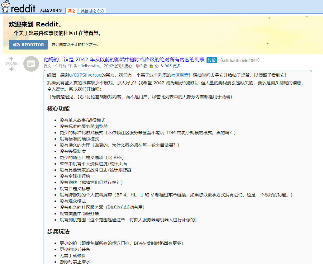 而认同这一论调的战地老玩家,则在逐条列出《战地2042》相比以往的战地系列作缺少的那些部分,试图印证“赶工”的那部分。