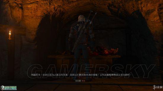 抵达地窖后发现这里刚刚遭遇恶战,守卫死在杰洛特的面前,开启感官能力可以发现踪迹导向地窖,进入地窖后一直追踪脚印,可以在停尸间找到一个赤身裸体的女子。不过这个女子并不是普通的人类,而是吸血鬼,女吸血鬼没有多余的话语,也没有打算留下杰洛特的性命。