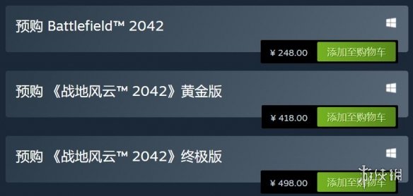 此次《战地2042》的预购分为三个版本:标准版为248元,黄金版为418元,终极版为498元,各位可以按需购买。