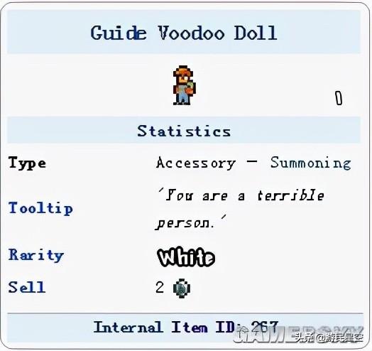 小镇的NPC也彻底乱了套,到处都充满着悲观的气氛,商人老头开始神神叨叨地吐槽我的脆弱无力,连树精姐姐都在反复念叨着腐化在泰拉世界扩展的进度,让人半点快活不了。转天,镇子上来了新的向导,全新的名字分明强调着他与之前离奇死亡的“前向导”之间的区别,但恶魔手上的巫毒娃娃在投入岩浆后,依旧会导致向导的暴毙和血肉之墙的攻击,向导巫毒娃娃的身上,还分明地写着一行小字“You are a terrible person”。