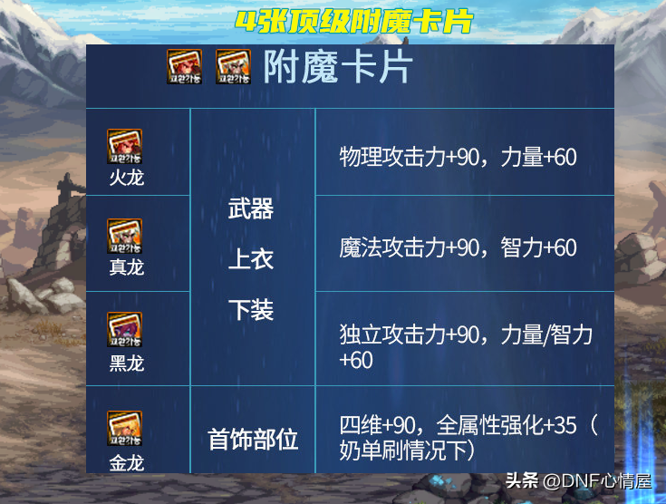 9月金秋版本,国服推出军团地下城,新增加4张全新附魔传说卡,分别是火龙、真龙、黑龙和金龙。火龙、真龙和黑龙3张传说附魔卡,针对武器、上衣和下装部位,赋予物理攻击力+90,力智+60、魔法攻击力+90,智力+60、独立攻击力+90、力量智力+60。