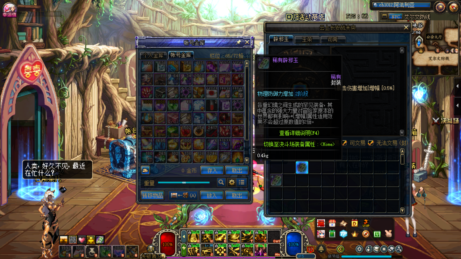 可以看到封装的辟邪玉和玉荣打开帐号仓库的时候是暗的,无法将其拖动到帐号仓库中,但可以在拍卖场交易的辟邪玉不能放仓库这一个操作也是无语了。