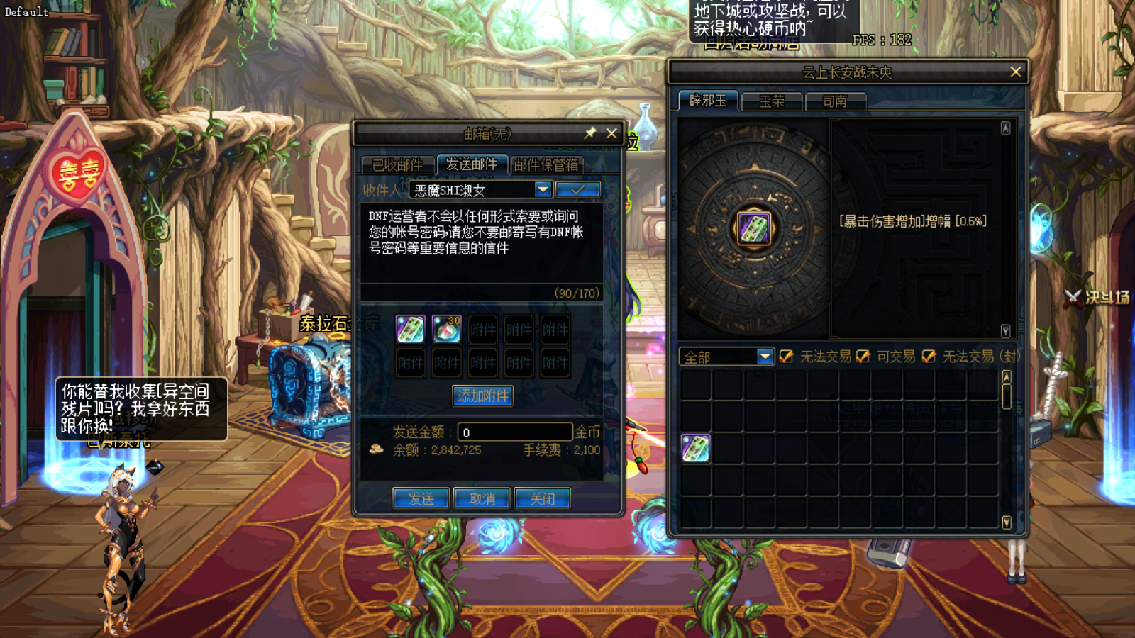 目前可以不需要通关拍卖场给小号辟邪玉的途径是通过发邮件,给帐号里的角色发送邮件,选择封装的辟邪玉和玉荣,发到指定的角色上即可。