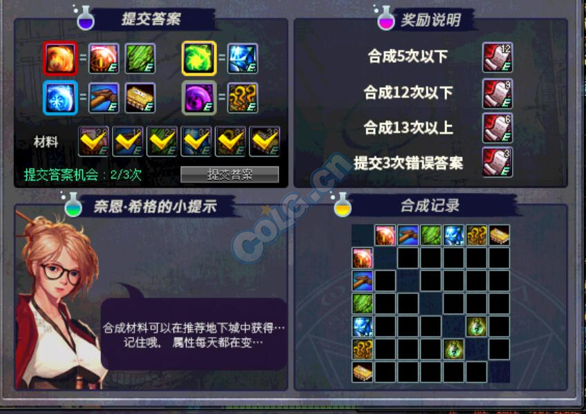 合出绿色药剂就可以提交答案,紫色和绿色珠子都是唯一,记下第一次错误的答案,基本两次就可以答出来