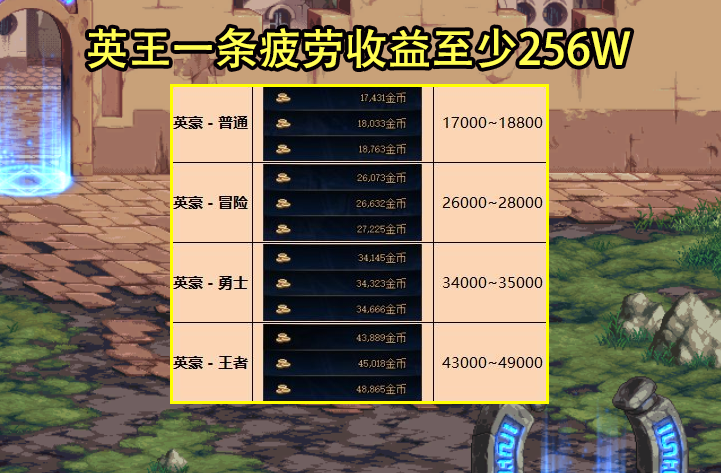 第三个是英豪白图收益上调,以白色大地普通~王者为例,掉落金币数量在5000~8000的范围内,翻牌收益在1W7~4.9W之间,如果按照英王等级计算,平均每张图掉落5个8000金币、翻牌4.5W金币,最少可获得256W金币左右。