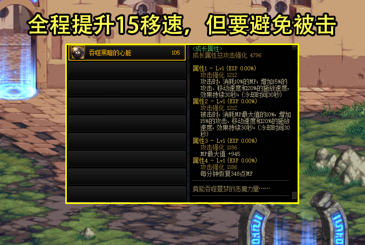 耳环推荐外号小洛多斯的信号弹、攻击时,最高增加30%攻速施放,前冲最高增加45%移速。魔法石推荐吞噬黑暗的心脏,只需消耗自身10%的MP就可以全程持续15%攻速、移动、20%的施放,不过被击时,效果会消失,要注意躲避。