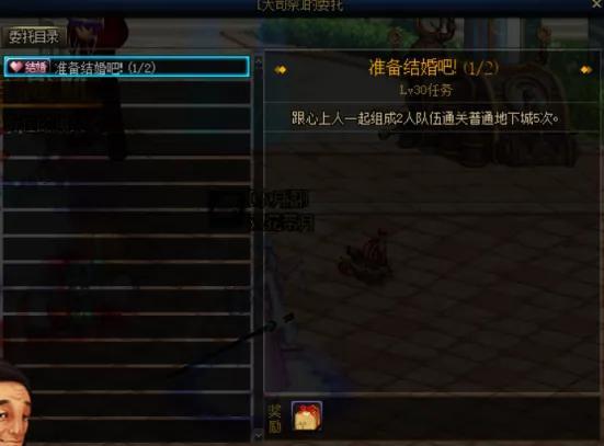 订婚成功之后就需要做两个婚前任务,第一个任务需要与结婚对象组队通关普通地下城5次,在完成任务之后可以获得一个真爱考验箱。(ps:真爱考验箱打开之后可以获取到绝情娃娃或心意娃娃)