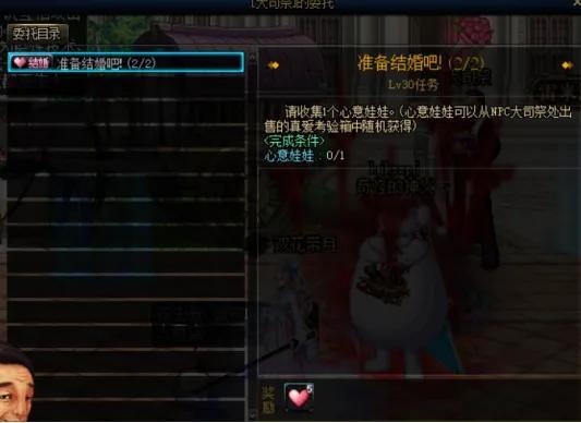 第二个任务则是要收集一个心意娃娃,该道具可以通过真爱考验箱中获取,也可以使用5个绝情娃娃在大司祭NPC商店兑换。