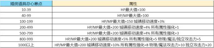 在成功完成结婚之后,双方勇士都会开启婚房(从赛丽亚房间的左侧即可进入婚房)。婚房也会为我们带来一定的属性加成,这个属性加成的高低和婚房装饰道具总心意点有关(具体属性如下图)。