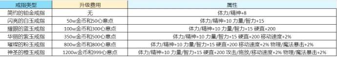 同时,在结婚之后,双方勇士也会带上结婚戒指,结婚戒指也可以为我们带来一定的属性,属性的多少与婚戒的品级有关(具体属性如下图)。