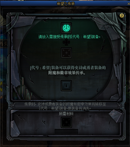 另外,之前的异界换装中的宝珠和白金徽章也可以二次利用,赛贝琳处使用希望之传承系统,可将史诗或勇者装备的技能宝珠和白金徽章继承到换装装备上,不过要注意,被传承的装备在传承后会消失。